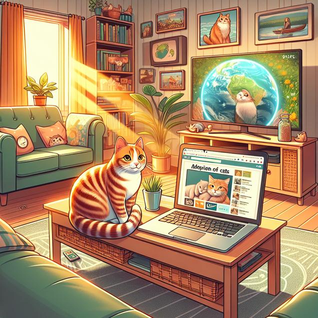 ChatGPT: In a cozy living room, a laptop is open on the coffee table, displaying the search results for "adopt a cat" on Google. At the same time, a tv screen in the background shows the MinuteEarth YouTube channel, with a queue of videos lined up. The videos are now longer, and a cute orange tabby cat is curled up next to the laptop, watching intently as the feline-focused content plays.