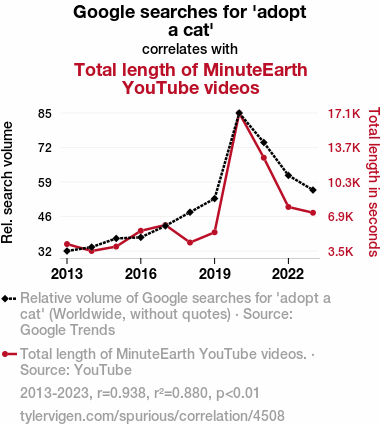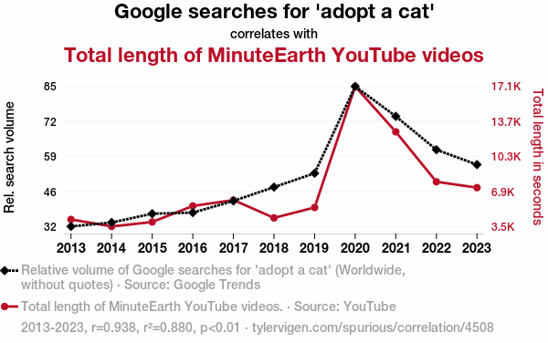 - The spurious research paper: Pawsitively Meowvelous: Exploring the Correlation Between Google Searches for 'Adopt a Cat' and Total Length of MinuteEarth YouTube Videos