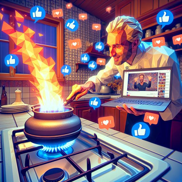 Prompt: Create an image of a low poly Dutch kitchen, featuring a chef adjusting the LPG stove knob. As the knob turns, a bright blue flame bursts to life, casting a warm glow on the surroundings. In the background, a laptop screen displays a video by LEMMiNO, surrounded by a flurry of likes and comments, symbolizing its popularity. This image should convey the interconnectedness between the use of LPG in the Netherlands and the surge in total likes on LEMMiNO's videos, in a visually captivating low poly style. The depiction should include only scenes, people, and objects, it should not include text or speech bubbles.