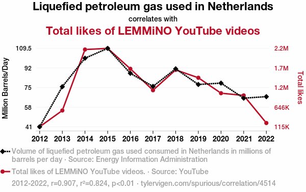 User prompt: Please provide potential search keywords for a paper titled Flickering Flames and Internet Fame: Exploring the Correlation Between Liquefied Petroleum Gas Consumption in Netherlands and Total Likes of LEMMiNO YouTube Videos with an abstract of In this study, we set out to investigate a peculiar link that has eluded both academia and common sense: the relationship between Liquefied Petroleum Gas (LPG) consumption in the Netherlands and the total likes garnered by the thought-provoking, edge-of-your-seat content of LEMMiNO YouTube videos. While the inquiry may appear unorthodox, our team delved into the data with the gravity of true scholars (albeit with a spoonful of humor). Utilizing data from the Energy Information Administration and the somewhat unorthodox choice of YouTube Analytics, we performed a comprehensive analysis spanning the years 2012 to 2022.