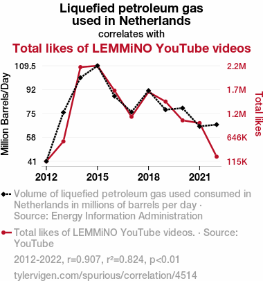This means 82.4% of the change in the one variable (i.e., Total likes of LEMMiNO YouTube videos) is predictable based on the change in the other (i.e., Liquefied petroleum gas used in Netherlands) over the 11 years from 2012 through 2022.