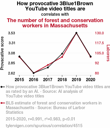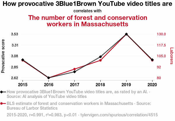 User prompt: Please make up a funny explanation for how increases in How provocative 3Blue1Brown YouTube video titles are positively influenced The number of forest and conservation workers in Massachusetts.\Make it sound serious until the end.