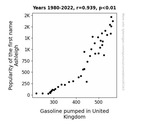 This means 88.1% of the change in the one variable (i.e., Gasoline pumped in United Kingdom) is predictable based on the change in the other (i.e., Popularity of the first name Ashleigh) over the 43 years from 1980 through 2022.