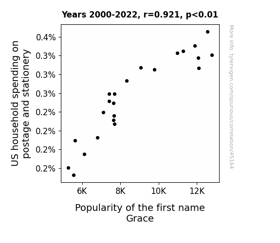 This means 84.8% of the change in the one variable (i.e., Popularity of the first name Grace) is predictable based on the change in the other (i.e., US household spending on postage and stationery) over the 23 years from 2000 through 2022.