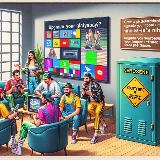ChatGPT: The Computerphile team, wearing stylish streetwear, is gathered in their office filming a YouTube video. The title on the screen reads "Hack Your Code Game with 90s Vibe" in bold and colorful letters. In the corner of the room, a locked cabinet labeled "Kerosene" sits, and a sign announces the nationwide ban. The team looks disappointed while holding their unused kerosene-powered dance machines.