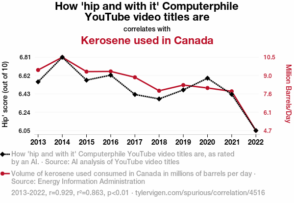This means 86.3% of the change in the one variable (i.e., Kerosene used in Canada) is predictable based on the change in the other (i.e., How 'hip and with it' Computerphile YouTube video titles are) over the 10 years from 2013 through 2022.