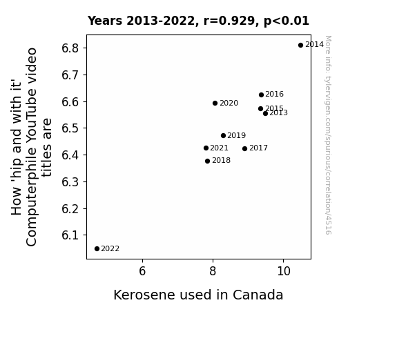 The correlation analysis revealed a strong relationship between the lexical flamboyance of Computerphile YouTube video titles and the consumption of kerosene in Canada. The correlation coefficient of 0.9289511 and a remarkable R-squared value of 0.8629501 for the time period 2013 to 2022 signify a robust association between these seemingly disparate entities. It seems that the allure of a well-crafted video title and the warm glow of kerosene share an unexpected harmony, reminiscent of the harmony in a melodious combustion.