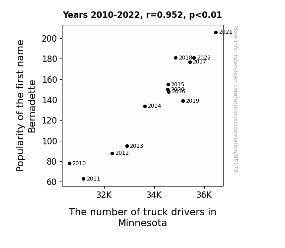 This means 90.5% of the change in the one variable (i.e., The number of truck drivers in Minnesota) is predictable based on the change in the other (i.e., Popularity of the first name Bernadette) over the 13 years from 2010 through 2022.