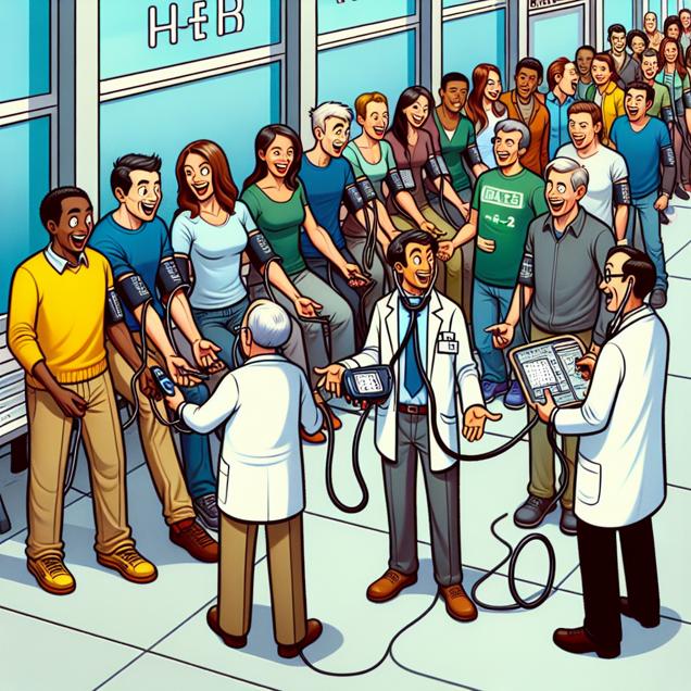 ChatGPT: Please respond with an image generation prompt that would be likely to create an interesting visual using DALL·E-3, using the following style: [ a humorous cartoon ] and depicting this scene: A group of excited math enthusiasts gather on a lively street, clutching blood pressure monitors, and energetically chatting about the latest Stand-up Maths video releases. Meanwhile, a long line of patients waiting for a phlebotomist stretches from a hospital entrance. Oddly, the phlebotomists are absent, as they are all happily engaged in the math discussions, measuring blood pressure and cheerfully exploring mathematical concepts. Image Generation Prompt: Produce an image portraying this amusing scenario, using a cartoon style with lively colors and dynamic facial expressions to capture the enthusiasm of the math enthusiasts. Emphasize the contrast between the bustling street and the patient-filled hospital doorway to convey the humorous irony of the situation.