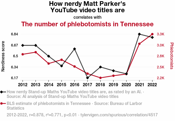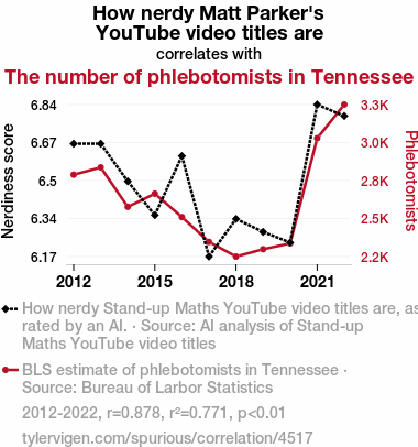 Nerdy, Stand-Up Maths, YouTube, video titles, phlebotomists, Tennessee, correlation, Bureau of Labor Statistics, AI analysis, Matt Parker, humor, demand, blood-drawers, quirky, statistically significant, data analysis, career choices, statistical correlation, correlation study, mathematical musings