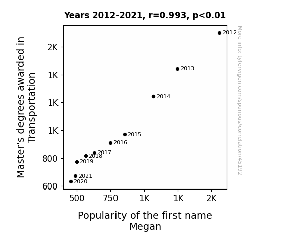 This means 98.6% of the change in the one variable (i.e., Popularity of the first name Megan) is predictable based on the change in the other (i.e., Master's degrees awarded in Transportation) over the 10 years from 2012 through 2021.