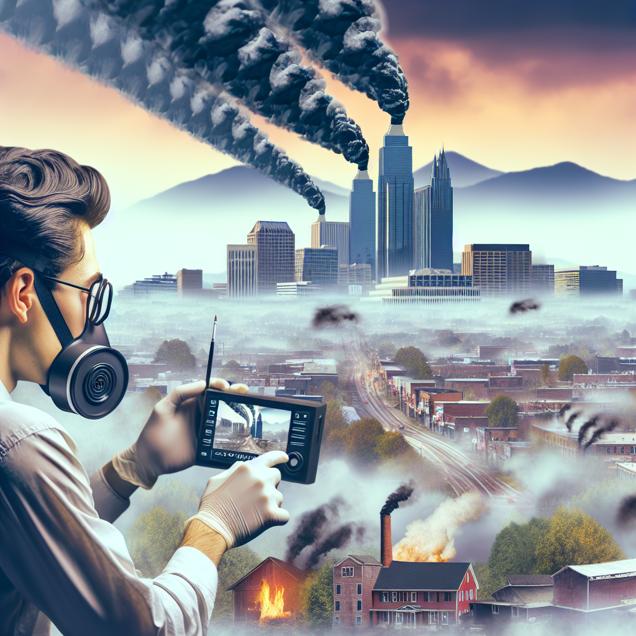 User prompt: Please describe a visual scene that prominently depicts both Air pollution in Sevierville, Tennessee and How provocative Tom Scott YouTube video titles are, in the following situation: As the smog thickened, so did the plot of Tom Scott's video titles, creating a 'hazy but snazzy' connection between the two. It's almost as if the pollution was fueling the production of clickbait content, leaving viewers both amused and slightly concerned about the air quality and the quality of puns. . Keep the description simple.