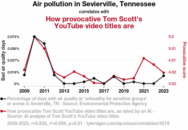 This means 69.4% of the change in the one variable (i.e., How provocative Tom Scott's YouTube video titles are) is predictable based on the change in the other (i.e., Air pollution in Sevierville, Tennessee) over the 15 years from 2009 through 2023.