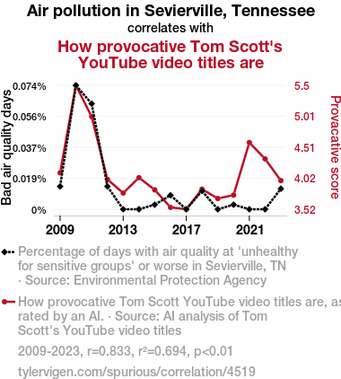 In the realm of social media, anecdotal observations and informal discussions have sparked intriguing speculations regarding the correlation at hand. Twitter user @AirQualityGuru mused, "Are we breathing in more than just particles? Could Sevierville's smog be shaping our digital cravings? #AirPollutionMystery." Meanwhile, a Reddit thread titled "Tom Scott's Titles and Tennessee Air – Coincidence or Conspiracy?" garnered attention, with users sharing playful hypotheses and humorous anecdotes about the potential interplay between Sevierville's air quality and YouTube's clickbait culture.