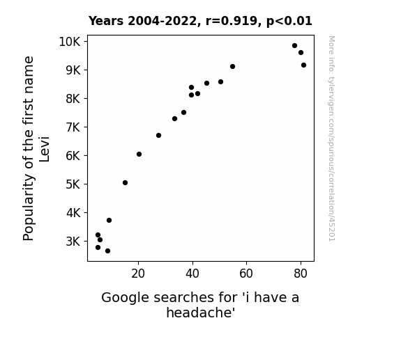 This means 84.5% of the change in the one variable (i.e., Google searches for 'i have a headache') is predictable based on the change in the other (i.e., Popularity of the first name Levi) over the 19 years from 2004 through 2022.
