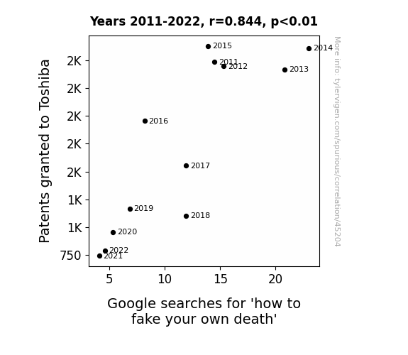 This means 71.2% of the change in the one variable (i.e., Google searches for 'how to fake your own death') is predictable based on the change in the other (i.e., Patents granted to Toshiba) over the 12 years from 2011 through 2022.