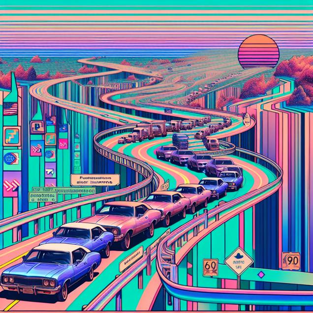 User prompt: Please respond with an image generation prompt that would be likely to create an interesting visual using DALLE-3, using the following style: [ Vaporwave ] and depicting this scene: In South Dakota, as annual US household spending on vehicle insurance increases, more people begin to feel the 'Bern' and vote for the Democrat Presidential candidate. Picture a road winding through the state, with cars symbolizing the increasing insurance costs driving up alongside growing support for the Democratic candidate. It's a visual representation of the increased cost of being a good driver and the political shift toward steering the country in the right direction. Keep the visual depiction simple. Do not include any words or speech bubbles.