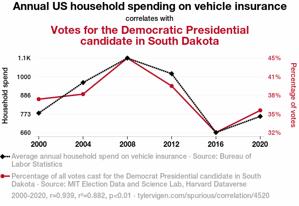 This means 88.2% of the change in the one variable (i.e., Votes for the Democratic Presidential candidate in South Dakota) is predictable based on the change in the other (i.e., Annual US household spending on vehicle insurance) over the 6 years from 2000 through 2020.