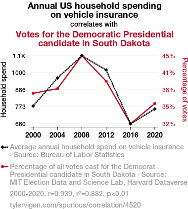 "vehicle insurance spending, democrat presidential candidate votes, south dakota, correlation coefficient, bureau of labor statistics, MIT election data and science lab, harvard dataverse, political preferences, fiscal responsibility, mount rushmore state"