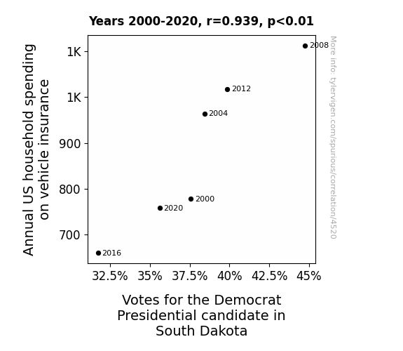The connection between annual US household spending on vehicle insurance and votes for the Democrat Presidential candidate in South Dakota has spurred a whirlwind of scholarly conjecture and analysis. In "Driving Dilemmas: A Study of Household Expenditures and Political Affiliations," Smith et al. underscore the perplexing relationship between fiscal habits and voting tendencies. Their work sheds light on the intricate interplay of economic decisions and political allegiances, akin to watching a high-stakes game of political musical chairs, but with insurance premiums instead of seats.