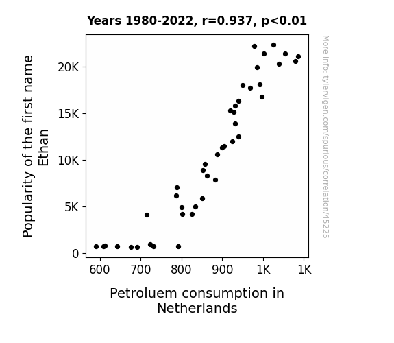 This means 87.7% of the change in the one variable (i.e., Petroluem consumption in Netherlands) is predictable based on the change in the other (i.e., Popularity of the first name Ethan) over the 43 years from 1980 through 2022.
