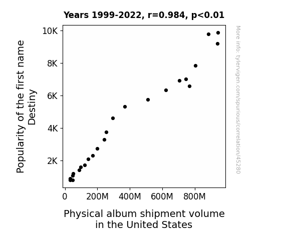 This means 96.8% of the change in the one variable (i.e., Physical album shipment volume in the United States) is predictable based on the change in the other (i.e., Popularity of the first name Destiny) over the 24 years from 1999 through 2022.