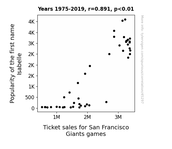 This means 79.5% of the change in the one variable (i.e., Ticket sales for San Francisco Giants games) is predictable based on the change in the other (i.e., Popularity of the first name Isabelle) over the 45 years from 1975 through 2019.