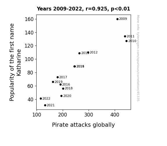 This means 85.5% of the change in the one variable (i.e., Pirate attacks globally) is predictable based on the change in the other (i.e., Popularity of the first name Katharine) over the 14 years from 2009 through 2022.