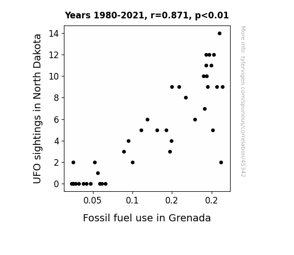 This means 75.9% of the change in the one variable (i.e., Fossil fuel use in Grenada) is predictable based on the change in the other (i.e., UFO sightings in North Dakota) over the 42 years from 1980 through 2021.