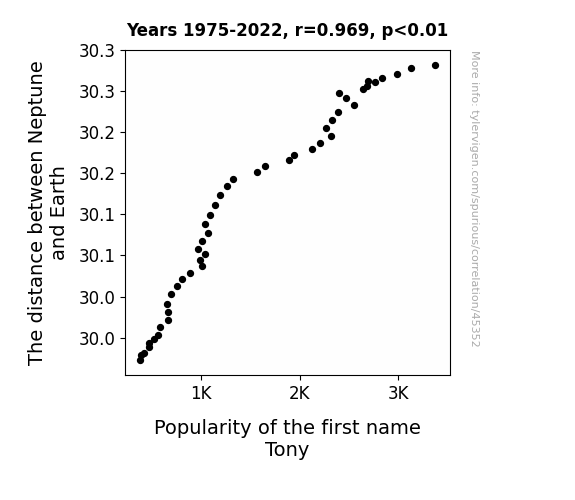 This means 93.9% of the change in the one variable (i.e., Popularity of the first name Tony) is predictable based on the change in the other (i.e., The distance between Neptune and Earth) over the 48 years from 1975 through 2022.