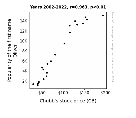 This means 92.7% of the change in the one variable (i.e., Chubb's stock price (CB)) is predictable based on the change in the other (i.e., Popularity of the first name Oliver) over the 21 years from 2002 through 2022.