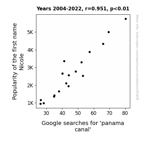 This means 90.5% of the change in the one variable (i.e., Google searches for 'panama canal') is predictable based on the change in the other (i.e., Popularity of the first name Nicole) over the 19 years from 2004 through 2022.