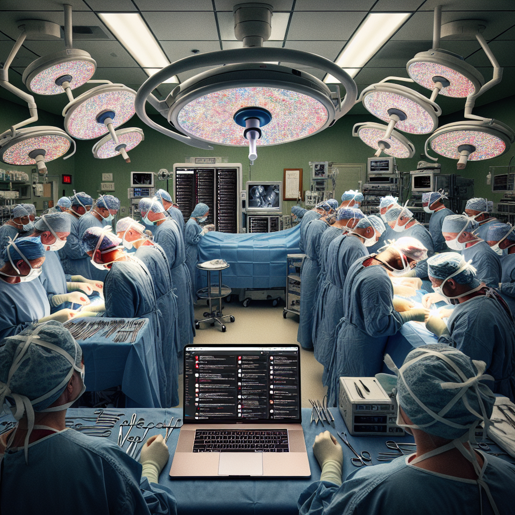 Prompt: Prompt: Generate an image where in the operating room of a hospital in South Dakota, surgical technologists are preparing for a procedure. As they work, a computer monitor displays a high-tech visual, with the image of Tom Scott's YouTube video along with a rapidly scrolling comment section indicating a surge in engagement. The technologists' focus on their tasks has a soothing effect, subtly influencing the heightened digital interaction happening in the virtual world. The resulting image should convey the juxtaposition of the intense activity in the operating room with the digital engagement on the computer monitor, highlighting the intersection of technology and human expertise in the medical setting. The depiction should include only scenes, people, and objects, it should not include text or speech bubbles.