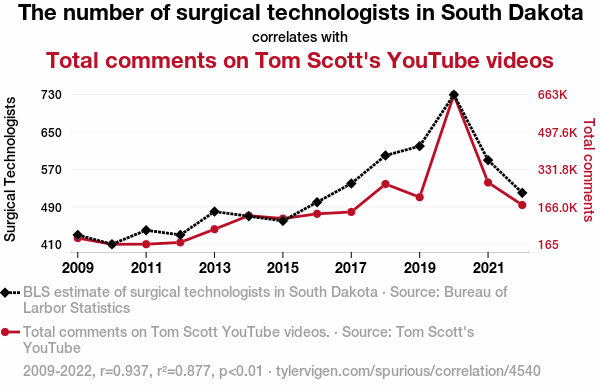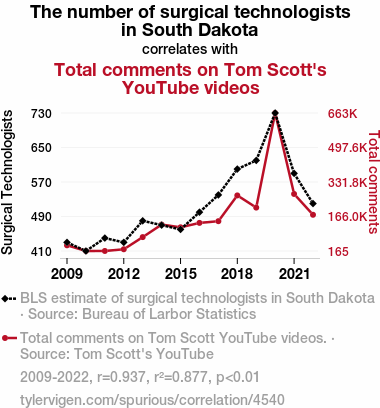 This means 87.7% of the change in the one variable (i.e., Total comments on Tom Scott's YouTube videos) is predictable based on the change in the other (i.e., The number of surgical technologists in South Dakota) over the 14 years from 2009 through 2022.
