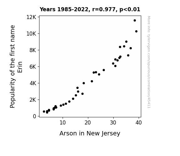 This means 95.5% of the change in the one variable (i.e., Arson in New Jersey) is predictable based on the change in the other (i.e., Popularity of the first name Erin) over the 38 years from 1985 through 2022.
