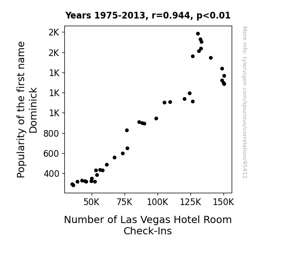 This means 89.2% of the change in the one variable (i.e., Number of Las Vegas Hotel Room Check-Ins) is predictable based on the change in the other (i.e., Popularity of the first name Dominick) over the 39 years from 1975 through 2013.