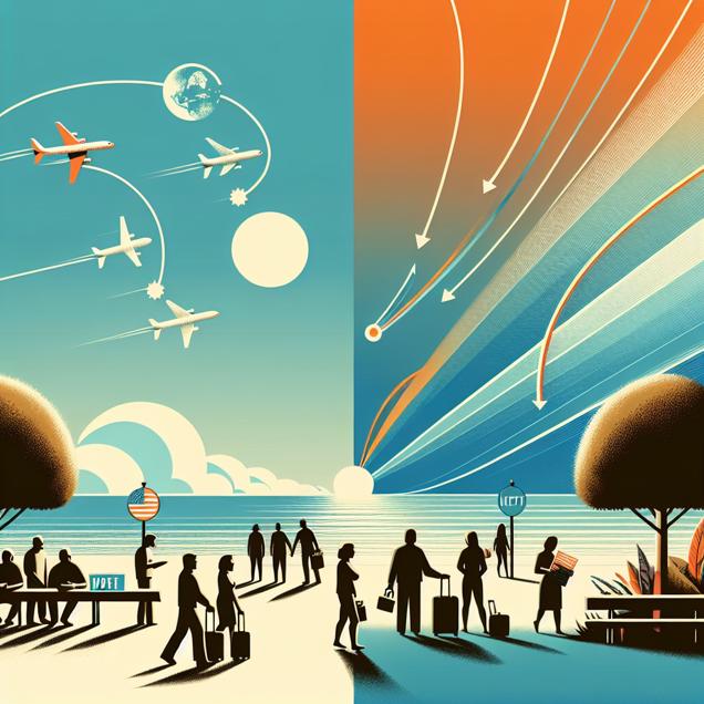 Prompt: Prompt: Create a minimalistic image that depicts a serene scene in Delaware, where voters are casting their ballots under a sunny sky. Show the voters proudly displaying their support for the Democratic presidential candidate, surrounded by green energy symbols and a subtle representation of a surging political wave. As the surge extends, depict a metaphorical jet stream that gracefully traverses the distance to Greenland. In Greenland, illustrate the demand for jet fuel rising alongside the momentum of the Democratic wave, symbolizing the unexpected correlation between political tides and fuel consumption. The depiction should include only scenes, people, and objects, it should not include text or speech bubbles.