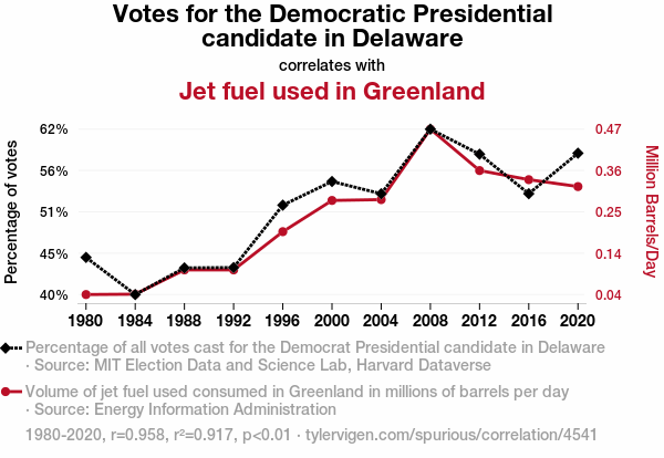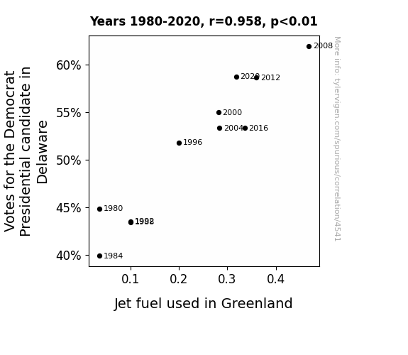 This means 91.7% of the change in the one variable (i.e., Jet fuel used in Greenland) is predictable based on the change in the other (i.e., Votes for the Democratic Presidential candidate in Delaware) over the 11 years from 1980 through 2020.