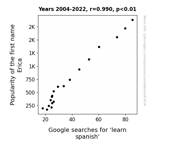 This means 98% of the change in the one variable (i.e., Google searches for 'learn spanish') is predictable based on the change in the other (i.e., Popularity of the first name Erica) over the 19 years from 2004 through 2022.