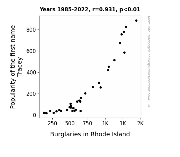 This means 86.7% of the change in the one variable (i.e., Burglaries in Rhode Island) is predictable based on the change in the other (i.e., Popularity of the first name Tracey) over the 38 years from 1985 through 2022.