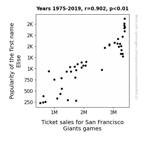 This means 81.4% of the change in the one variable (i.e., Ticket sales for San Francisco Giants games) is predictable based on the change in the other (i.e., Popularity of the first name Elise) over the 45 years from 1975 through 2019.