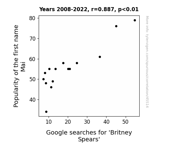 This means 78.7% of the change in the one variable (i.e., Google searches for 'Britney Spears') is predictable based on the change in the other (i.e., Popularity of the first name Mai) over the 15 years from 2008 through 2022.