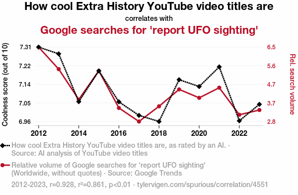 This means 86.1% of the change in the one variable (i.e., Google searches for 'report UFO sighting') is predictable based on the change in the other (i.e., How cool Extra History YouTube video titles are) over the 12 years from 2012 through 2023.