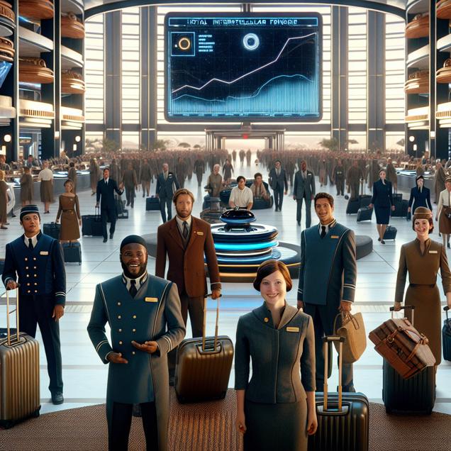 Prompt: Generate an image that resembles a scene from 'Star Wars,' set in a bustling hotel lobby in Indiana. The scene features a group of bellhops enthusiastically welcoming a wave of tourists with their luggage. In the background, a large digital screen displays the soaring average views of Extra History YouTube videos, hinting at the surge in historical interest that is attracting visitors to Indiana. The tone should evoke both the exciting energy of a bustling hotel lobby and the futuristic world of 'Star Wars.' The depiction should include only scenes, people, and objects, it should not include text or speech bubbles.