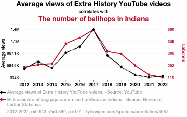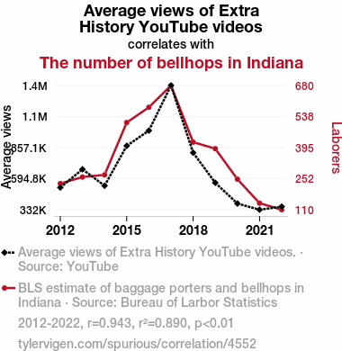 This means 89% of the change in the one variable (i.e., The number of bellhops in Indiana) is predictable based on the change in the other (i.e., Average views of Extra History YouTube videos) over the 11 years from 2012 through 2022.