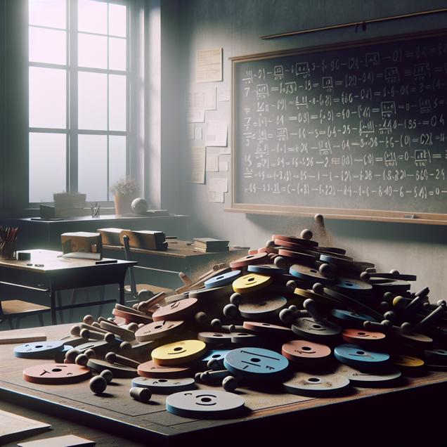 Prompt: Generate an image of a dimly lit room with a cluttered desk, on which a stack of YouTube video titles with mathematical puns is scattered. The dust gathering on the titles symbolizes the diminishing number of teachers. Outside the window, visualize an empty classroom with just a few agricultural sciences teachers in Oregon. The unprofessional video titles reflect the decline of professionalism in stand-up math. The scene should convey a sense of both high-tech and a somber atmosphere. The depiction should include only scenes, people, and objects, it should not include text or speech bubbles.