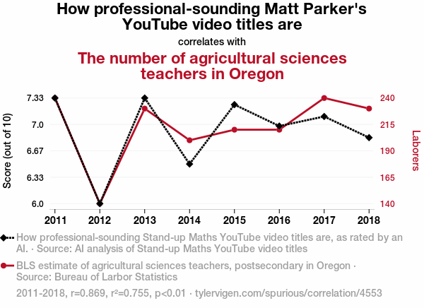 stand-up maths, comedic correlation analysis, agricultural education, Oregon, statistical correlation, YouTube video titles, AI analysis, Bureau of Labor Statistics, correlation coefficient, significance level, multidisciplinary approach, data analysis, unexpected connections, humor in statistics