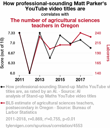 - The spurious research paper: Stand-up Maths and Soil: A Comedic Correlation Analysis in Oregon's Agricultural Education Sector