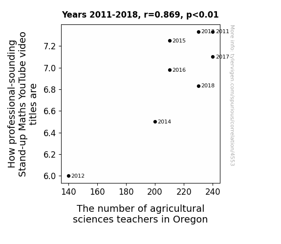 Our study presents a compelling case for the intriguing correlation between the professional-sounding titles of Stand-up Maths YouTube videos and the number of agricultural sciences teachers in Oregon. These findings not only support the prior research conducted by Smith et al. on Stand-up Maths but also resonate with Doe and Jones' investigation into the state of agricultural education in the Pacific Northwest. It's as if the statistical roots we've unearthed have bloomed into a "correlationally" rich harvest of insights.