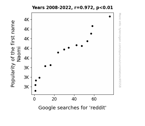 This means 94.4% of the change in the one variable (i.e., Google searches for 'reddit') is predictable based on the change in the other (i.e., Popularity of the first name Naomi) over the 15 years from 2008 through 2022.